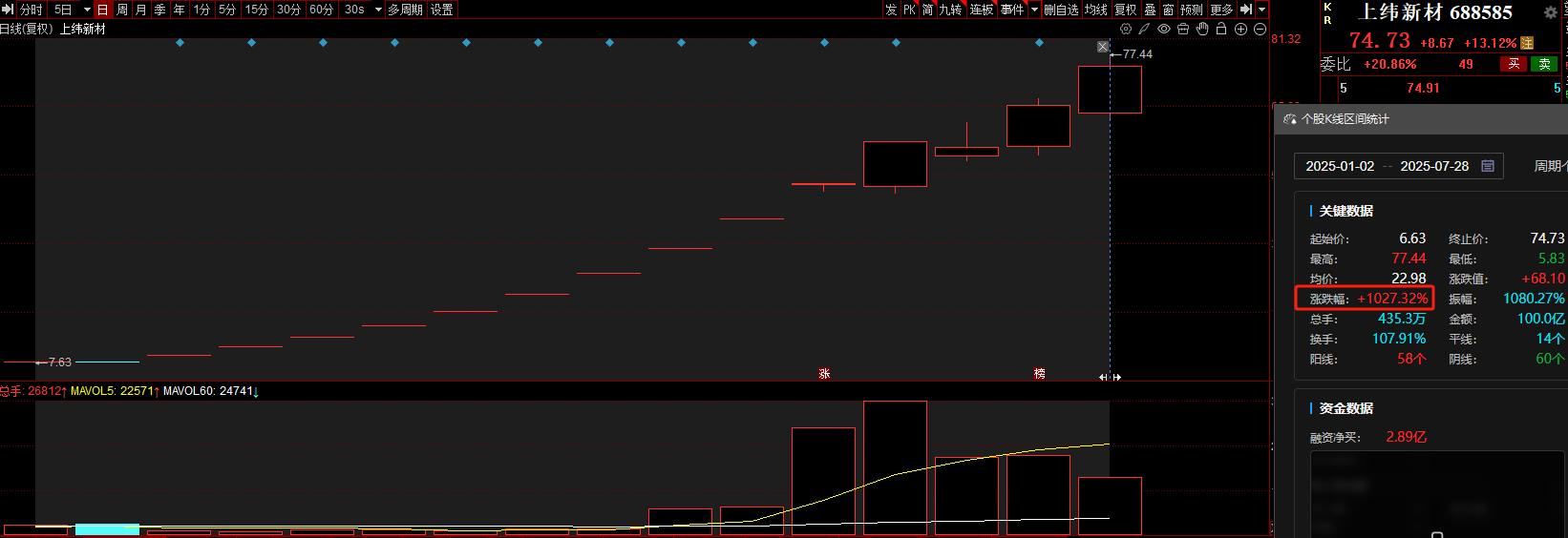 今日早盘,上纬新材呈现低开高走态势,盘中一度拉升超17%,股价续刷历史新高,一举成为2025年A股首只10倍股。截至午间收盘,该股仍维持13.12%的涨幅,延续强势表现。7月以来,该股曾10个交易日走出涨停行情,一举刷新A股“20cm”连板的纪录。