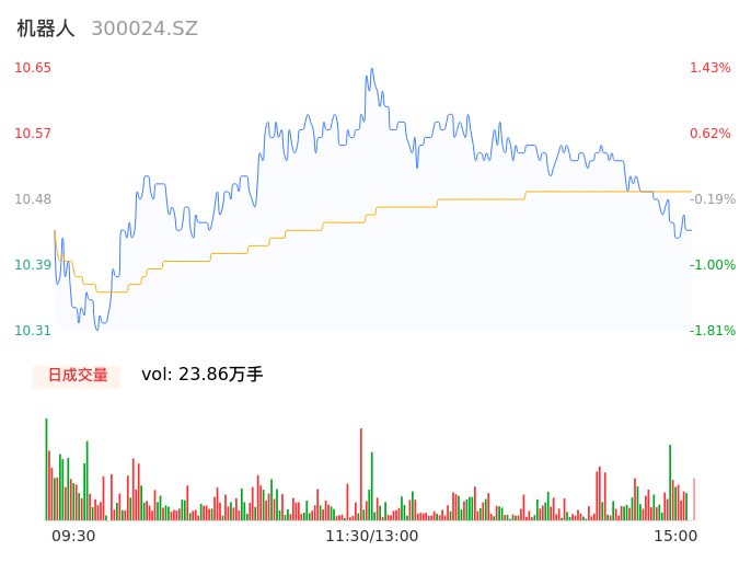 04月18日,机器人收报10.44,股价涨幅-0.57%,成交金额2.51亿元,换手率1.58%。