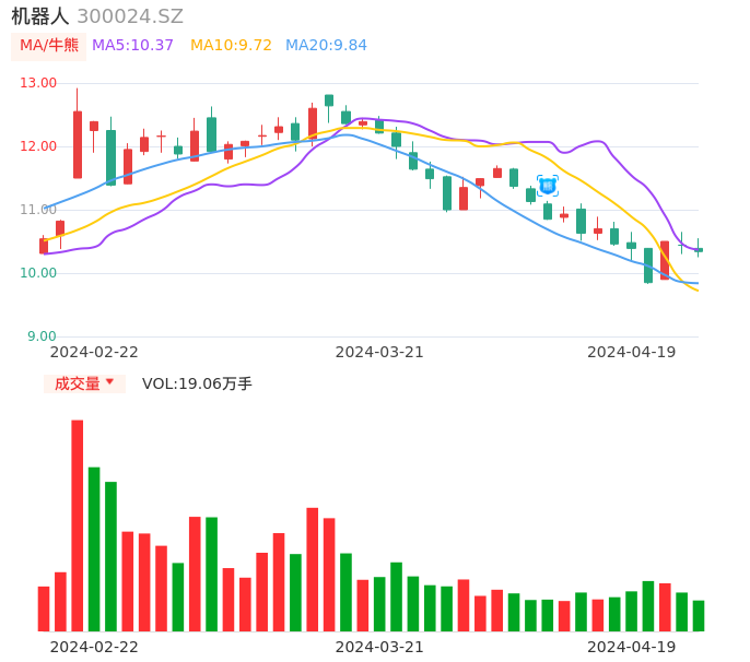 04月19日,机器人收报10.34,股价涨幅-0.96%,成交金额1.98亿元,换手率1.26%。