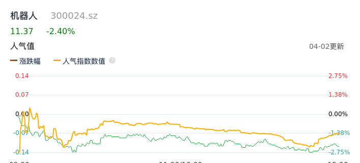 04月02日,机器人收报11.37,股价涨幅-2.40%,成交金额2.67亿元,换手率1.54%。