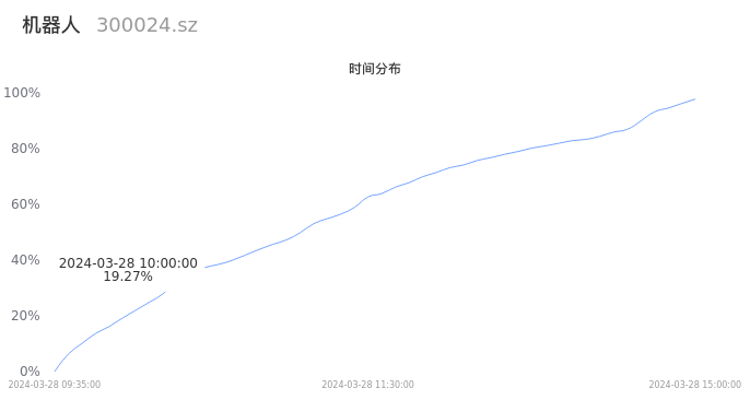 300024机器人2024年03月28日成交31.99万手,成交金额3.62亿元,相较昨日放量4.22万手,换手率2.11%,成交清淡。
