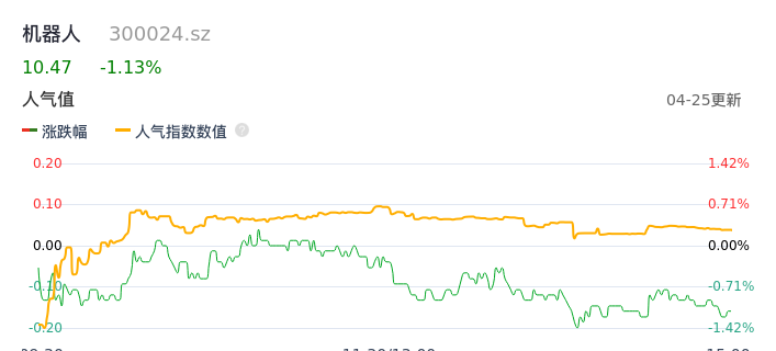 04月25日,机器人收报10.47,股价涨幅-1.13%,成交金额2.04亿元,换手率1.28%。