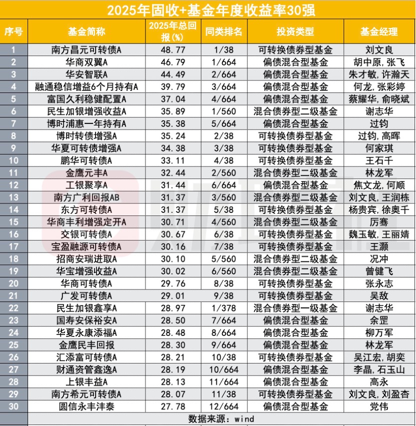 前十名中,还有融通稳信增益6个月持有、富国久利稳健配置、民生加银增强收益、博时浦惠一年持有、博时转债增强、华夏可转债增强以及鹏华可转债,年度回报率均超过了33%。