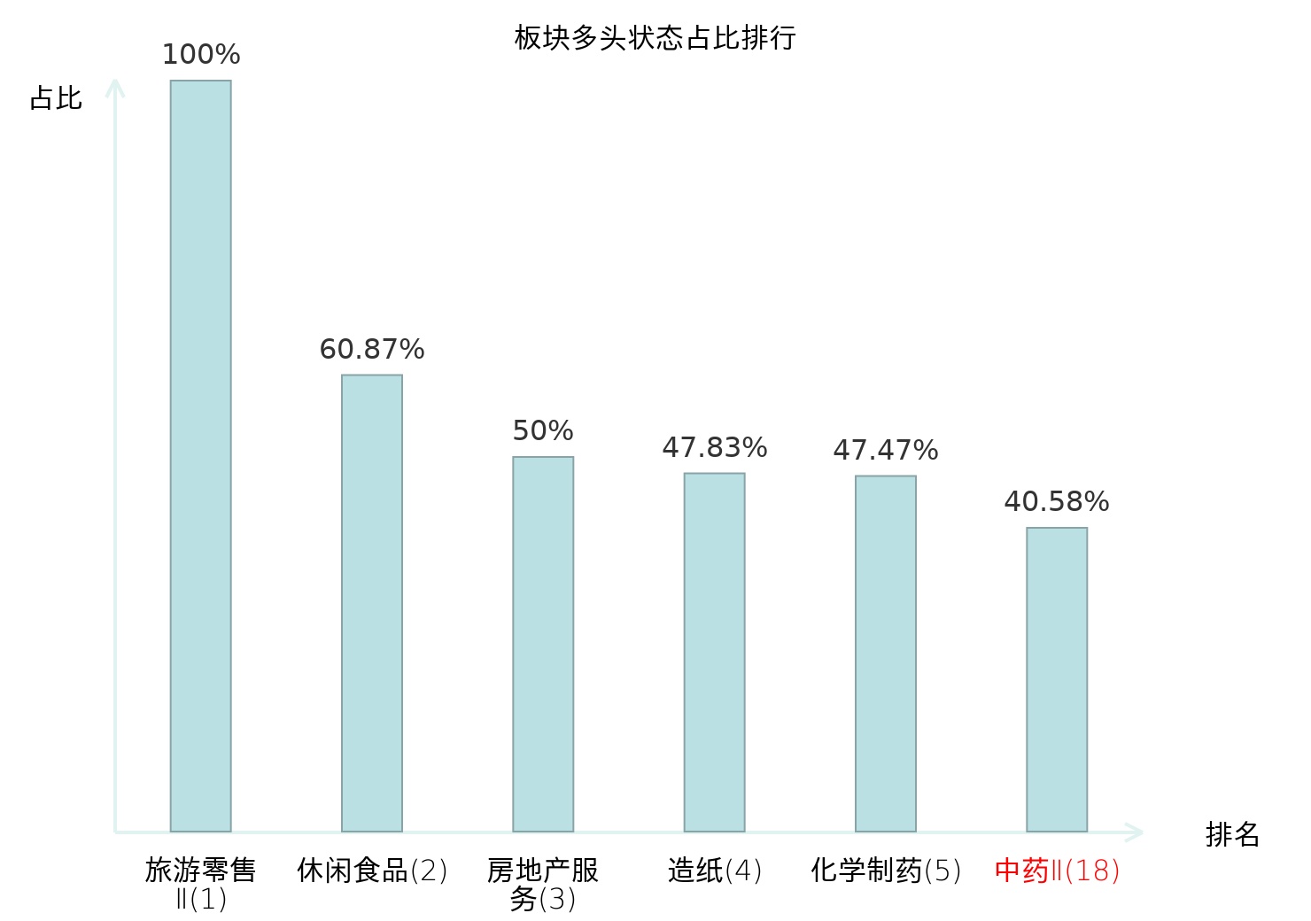 全市场所有行业板块中主力多头状态占比排名中,旅游零售Ⅱ板块位居第一。种植业板块名次提升最快,较昨日上升49位。