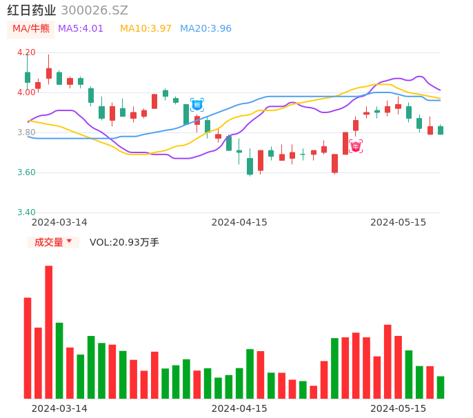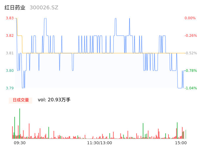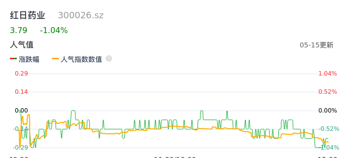 05月15日,红日药业收报3.79,股价涨幅-1.04%,成交金额7971.70万元,换手率0.76%。