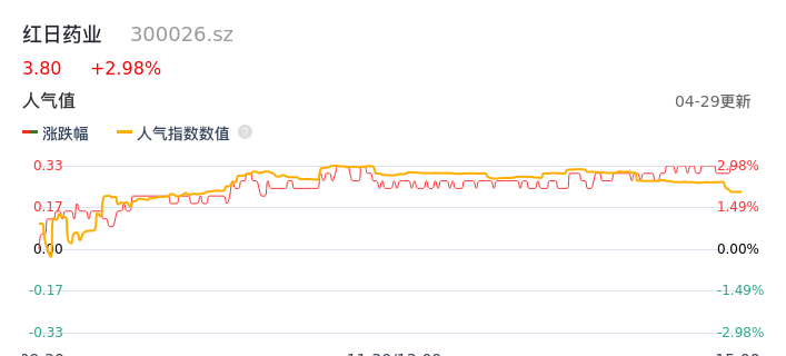 04月29日,红日药业收报3.80,股价涨幅2.98%,成交金额1.50亿元,换手率1.45%。