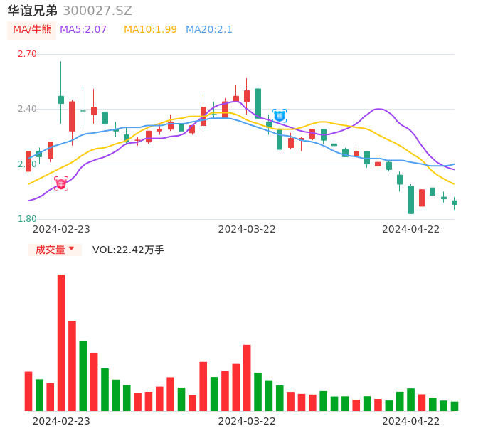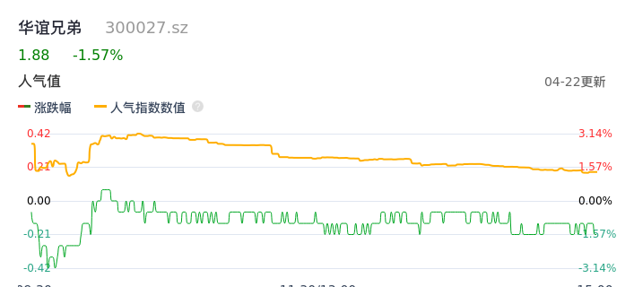04月22日,华谊兄弟收报1.88,股价涨幅-1.57%,成交金额4226.48万元,换手率0.93%。