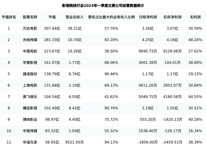 华谊兄弟最新报告期数据为一季度,下表汇总了影视院线行业内市值靠前的公司一季度主要经营数据