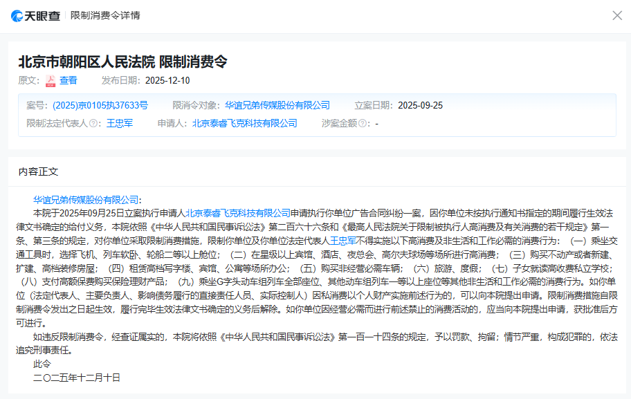 财联社12月12日讯,天眼查法律诉讼信息显示,近日,华谊兄弟传媒股份有限公司(300027.SZ)及其法定代表人王忠军新增一则限制消费令,涉及广告合同纠纷案件,申请人为北京泰睿飞克科技有限公司,执行法院为北京市朝阳区人民法院。