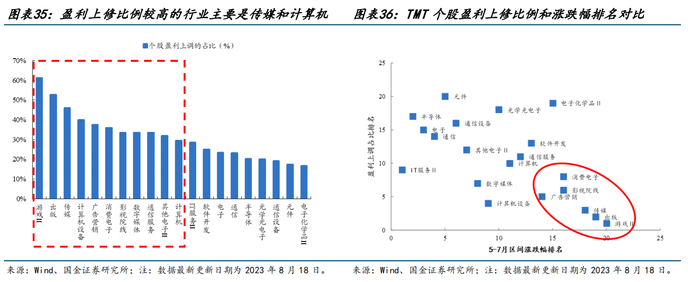 传媒>计算机,盈利回升持续更强、弹性更大,结合5-8月各行业的区间涨跌幅排名比较来看,张弛筛选出个股盈利上调占比较高但短期定价尚不充分的行业包括:游戏、出版、广告营销、影视院线、IT服务,主要集中于传媒和计算机行业中。