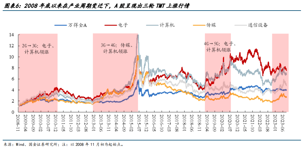 当下是否应该抹去“悲观情绪”,迎接新一轮TMT投资机遇?回顾A股历史,张弛总结出,2008年底以来在产业周期变迁下,A股呈现出三轮TMT上涨行情。主要包括:2008年11月-2010年12月、2012年12月-2015年6月、2019年1月底-2020年2月。