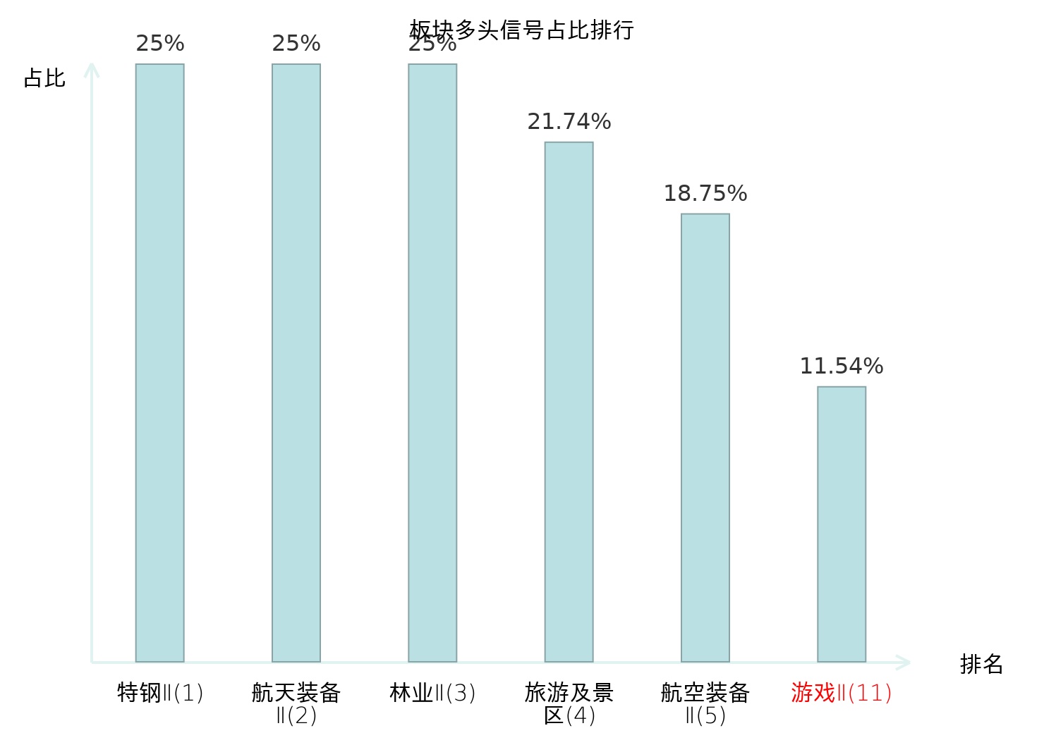 全市场所有行业板块中主力多头信号占比排名中,特钢Ⅱ板块位居第一。林业Ⅱ板块名次提升最快,较昨日上升122位。