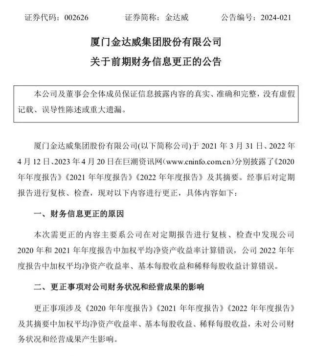4月8日晚,金达威发布公告称,公司在对定期报告进行复核、检查中发现,2020年和2021年年度报告中加权平均净资产收益率计算错误,2022年年度报告中加权平均净资产收益率、基本每股收益和稀释每股收益计算错误。
