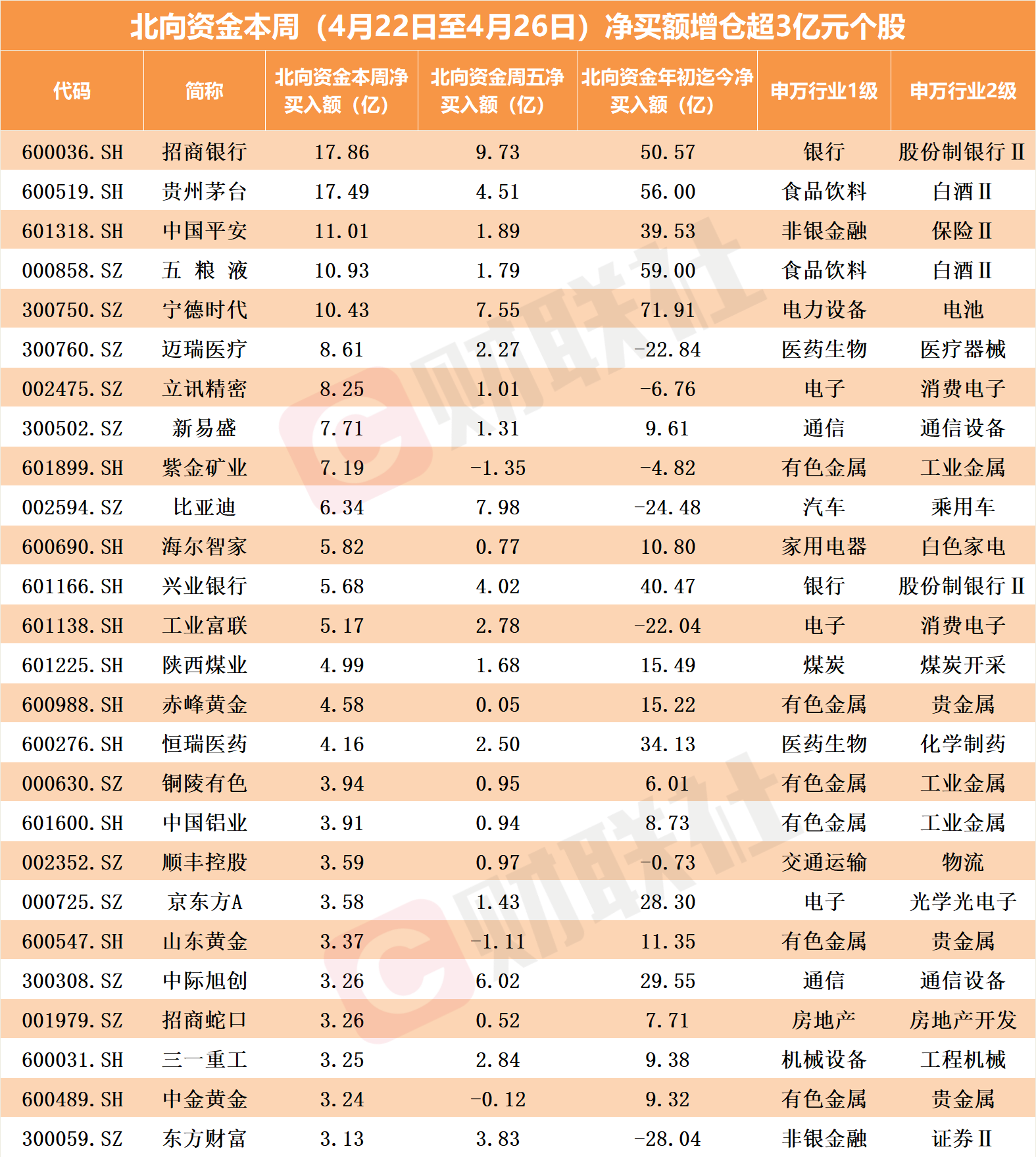 从周度(4月22日至26日)表现看,北向资金周净买额累计超3亿元的个股见下表。具体来看,招商银行贵州茅台净买入额分别为17.86亿元和17.49亿元,中国平安五粮液宁德时代加仓额均超10亿元。
