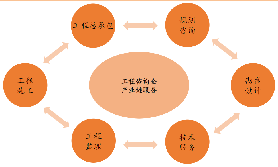 公司深耕建筑市政、水利水电、生态环保、公路交通四大领域,提供包括规划咨询、勘察设计、工程监理、工程施工、工程总承包(EPC)、技术服务在内的全过程工程咨询: