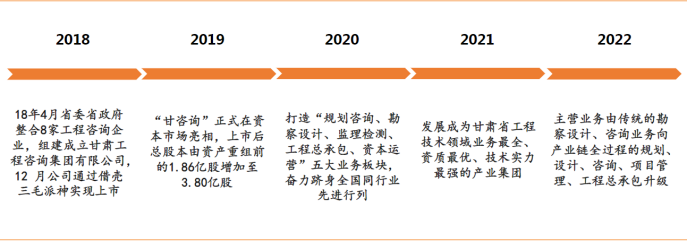 甘咨询全称为甘肃工程咨询集团股份有限公司,成立于2018年4月,由甘肃省建筑设计研究院有限公司、甘肃省水利水电勘测设计研究院有限责任公司等8家子公司整合重组而成,2018年12月公司通过借壳三毛派神实现上市,上市后主体更名为甘咨询。