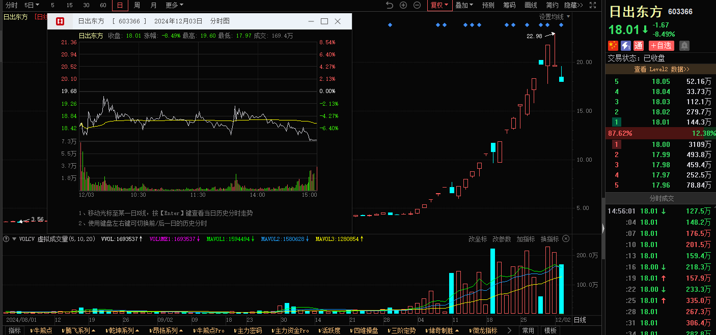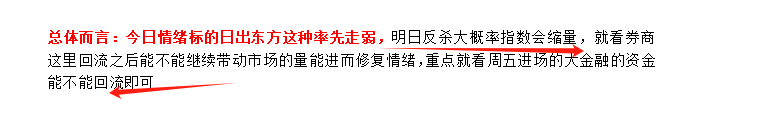 情绪标(涨的高的能够影响短线活跃资金的票):日出东方的走弱。这种怎么理解:每一波行情,都会有情绪的资金的推动,情绪资金往往先于指数走出行情,因为短线资金相对较为敏锐,那么这种股票就能当做市场先前的情绪标去看,一旦他连续走弱,就像是昨天到今天连续大跌,那么市场的反馈就会较为剧烈: