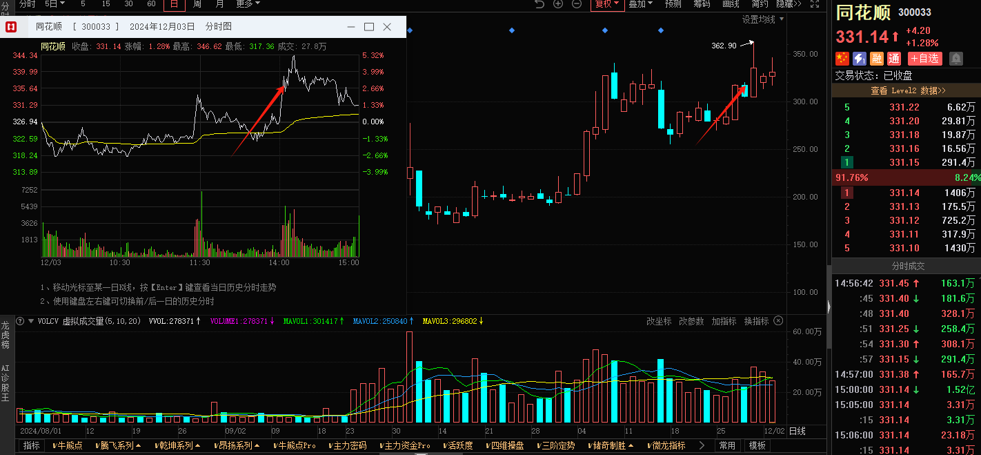 再看第二点:金融的回流,今天早盘市场其实是略微放量的,后续指数效应不好之时,大金融拉升带着市场回升,今天我们就能看到尾盘受到消息预期的影响而出现回流,比如同花顺、东方财富冲高回升