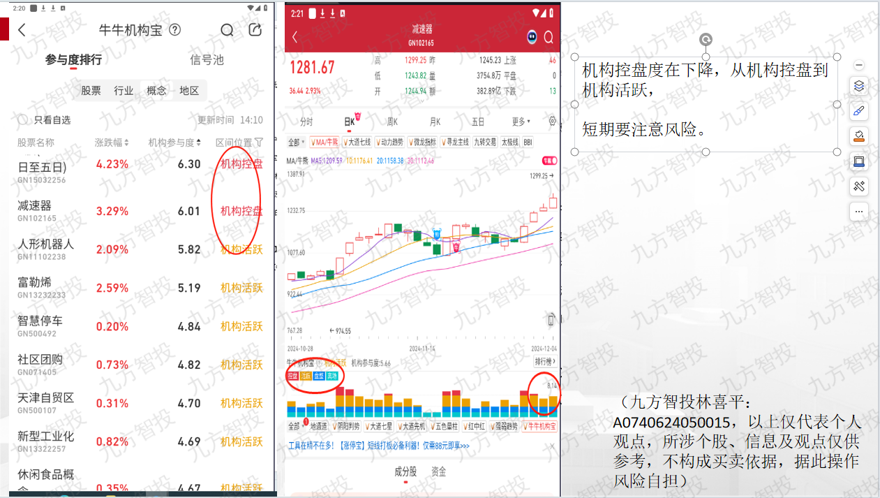 4、观点:优先寻找机构、个股同步上升的概念(减速器),注意高抛低吸