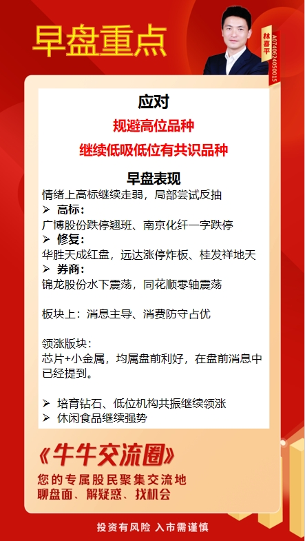 应对:规避高位品种,继续低吸低位有共识品种。