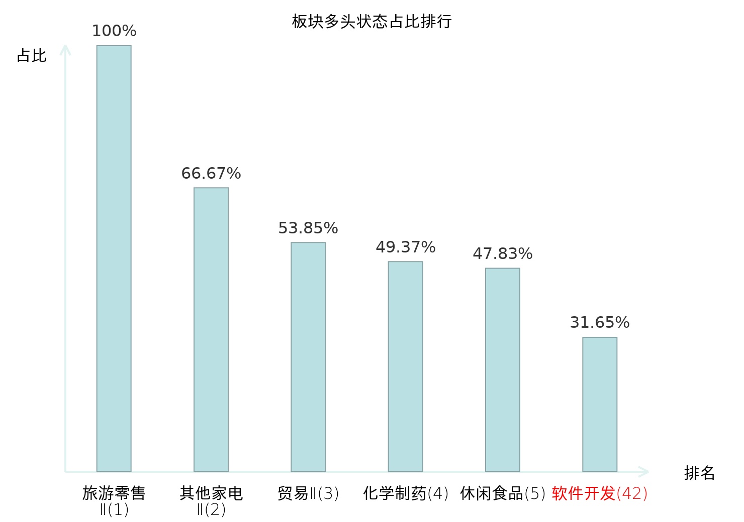 全市场所有行业板块中主力多头状态占比排名中,旅游零售Ⅱ板块位居第一。互联网电商板块名次提升最快,较昨日上升55位。