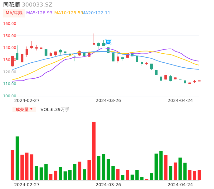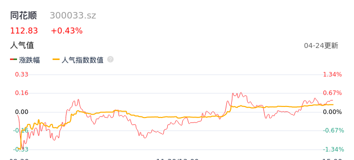 04月24日,同花顺收报112.83,股价涨幅0.43%,成交金额7.17亿元,换手率2.34%。