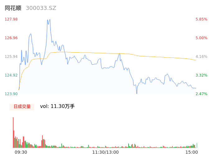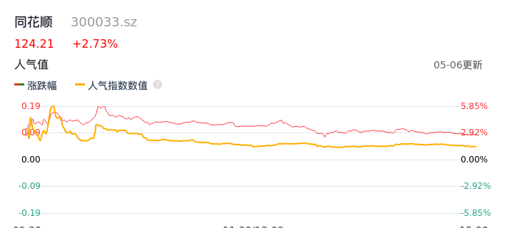 05月06日,同花顺收报124.21,股价涨幅2.73%,成交金额14.20亿元,换手率4.13%。