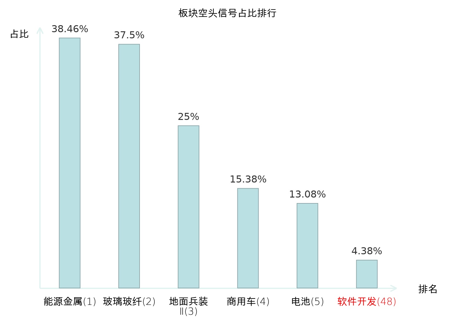 全市场所有行业板块中主力空头信号占比排名中,能源金属板块位居第一。通信服务板块名次提升最快,较昨日上升102位。