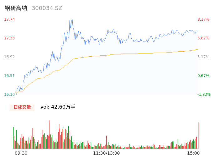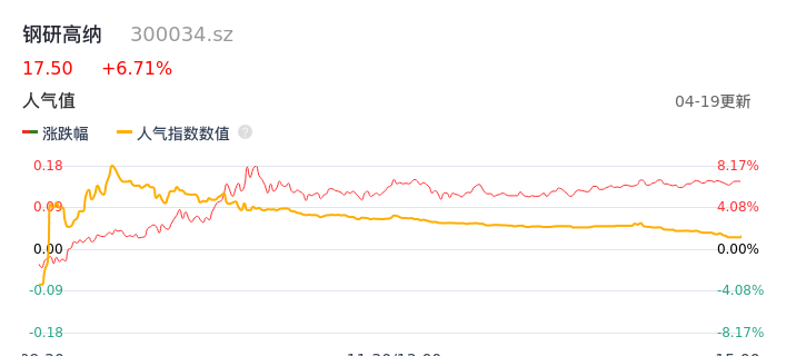 04月19日,钢研高纳收报17.50,股价涨幅6.71%,成交金额7.28亿元,换手率5.56%。