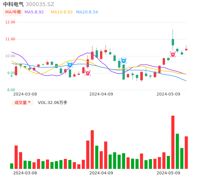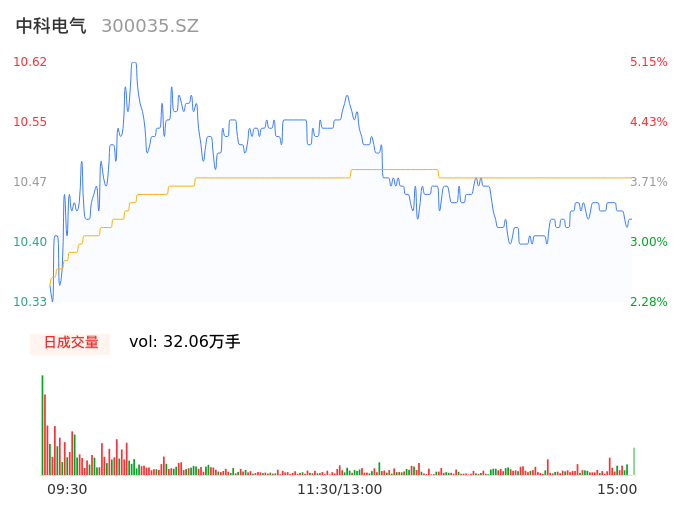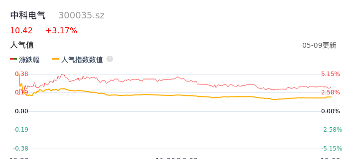 05月09日,中科电气收报10.42,股价涨幅3.17%,成交金额3.36亿元,换手率5.16%。