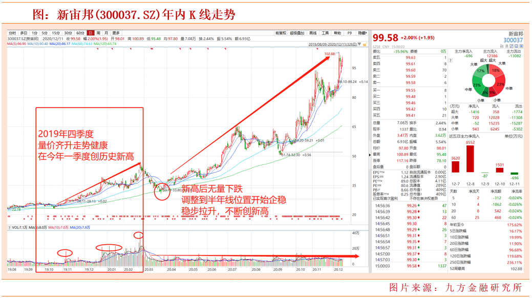 以新宙邦为例,2020年4月回调到趋势线后开启一波拉升,可以发现随后的量价大部分时间并不匹配,这就是典型的主力高控盘,如果买到就是稳稳的幸福。