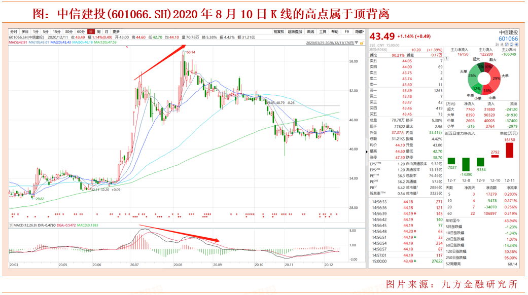 以中信建投为例,公司股价在2020年8月10日创出的高点,与7月9日的高点形成明显背离。