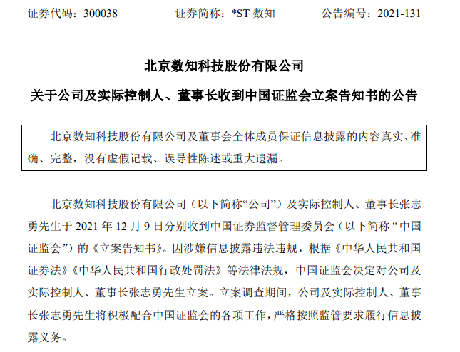 12月13日晚间,*ST数知发布公告,因涉嫌信息披露违法违规,公司及实控人、董事长张志勇已于12月9日收到证监会的《立案调查通知书》,这已经是张志勇年内第二次被立案调查。