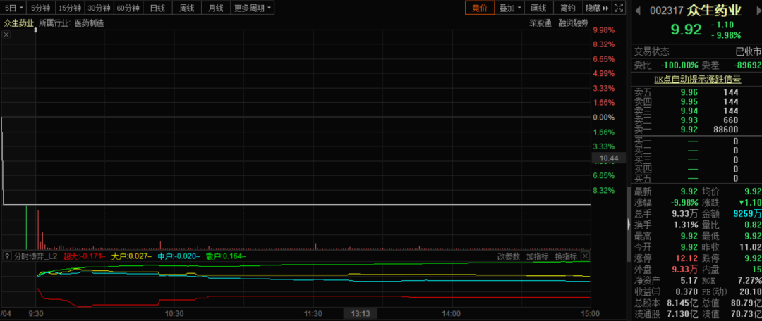 毫无悬念,今日开盘,众生药业股价便一字跌停,截至收盘,股价报收9.92元,封单近9万手。