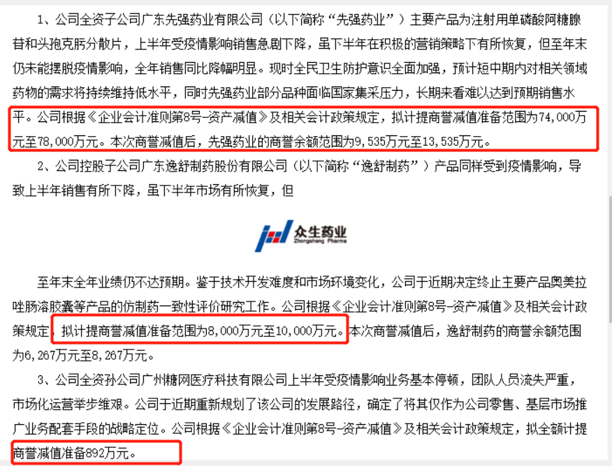 2020年度业绩预告将陆续发布,“商誉雷”开始发酵。1月3日晚间,众生药业发布业绩预告,预计2020年亏损3.8亿元-4.5亿元,上年同期盈利3.2元,拟分别计提先强药业、逸舒制药、广州糖网商誉减值准备7.4亿元至7.8亿元、8000万元至1亿元、892万元。按定格计算,最高计提近9亿商誉减值。