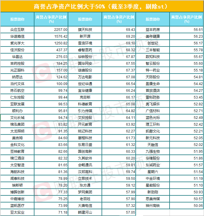 数据显示,截至2020年三季度末,全部A股商誉规模共计1.28万亿元,商誉占净资产(股东权益)比例为2.84%,金额和占比较前两年同期均有所回落。不过观察发现,剔除ST后,仍有83家公司商誉占净资产(股东权益)比例大于50%,减值风险较大。其中,传媒领域27家,占比近四分之一。