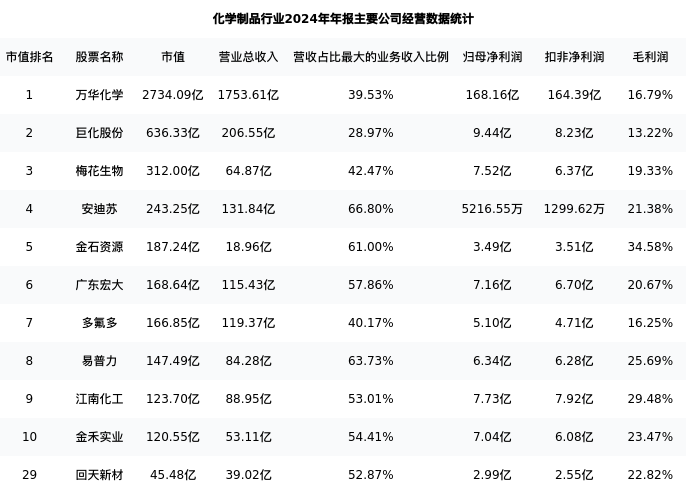 回天新材最新报告期数据为年报,下表汇总了化学制品行业内市值靠前的公司年报主要经营数据