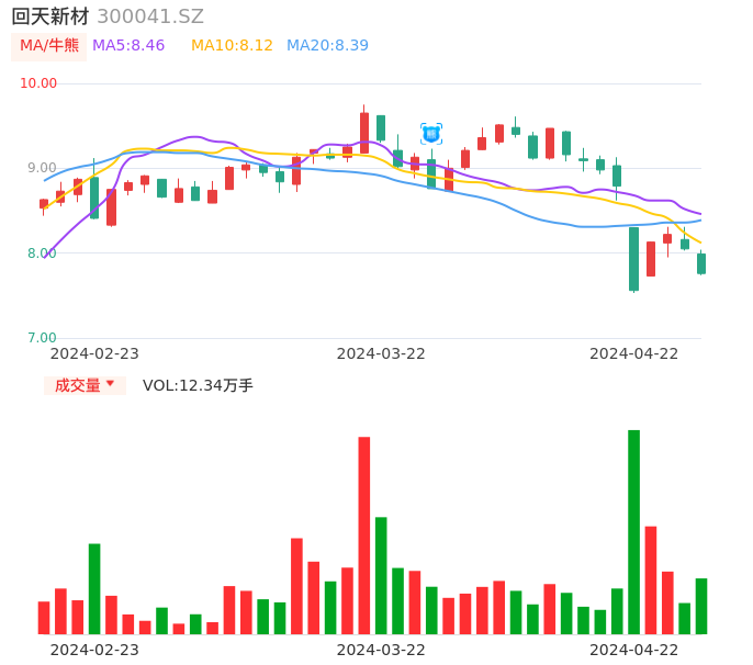 04月22日,回天新材收报7.76,股价涨幅-3.60%,成交金额9651.47万元,换手率2.27%。