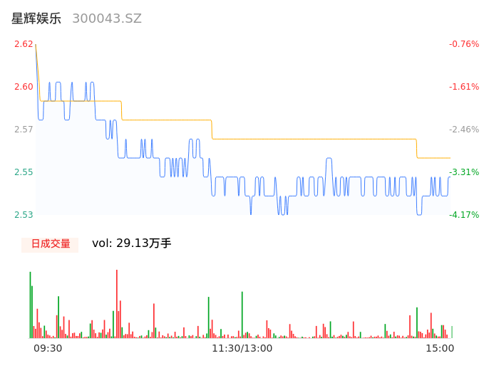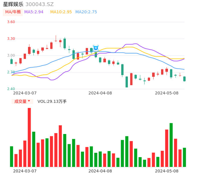 05月08日,星辉娱乐收报2.54,股价涨幅-3.79%,成交金额7462.18万元,换手率2.34%。