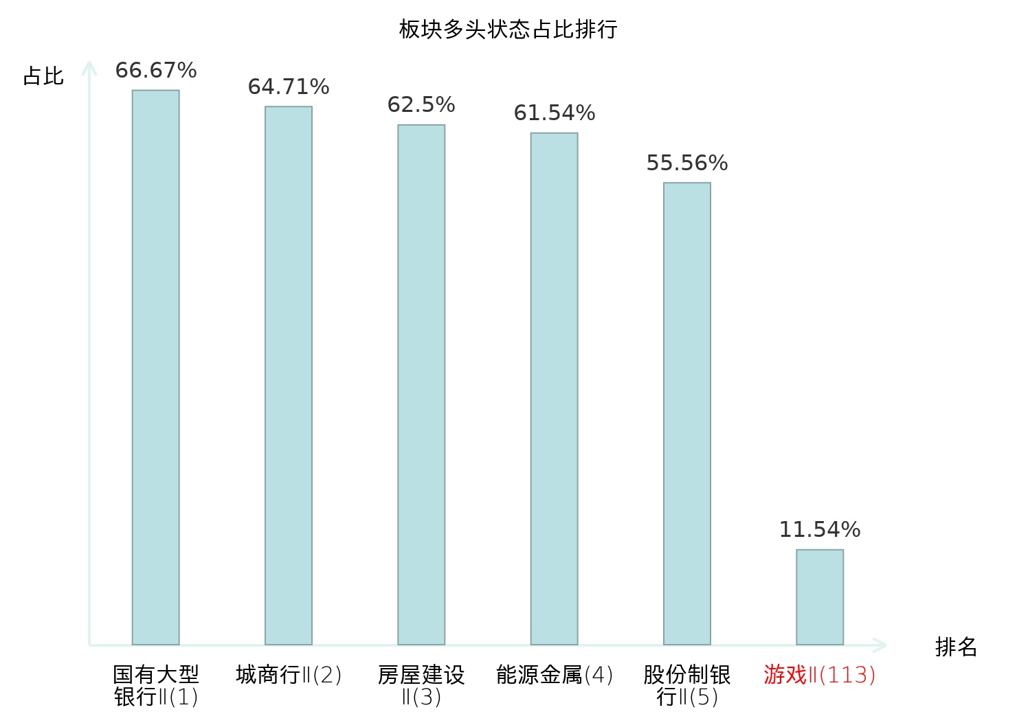 全市场所有行业板块中主力多头状态占比排名中,国有大型银行Ⅱ板块位居第一。普钢板块名次提升最快,较昨日上升65位。