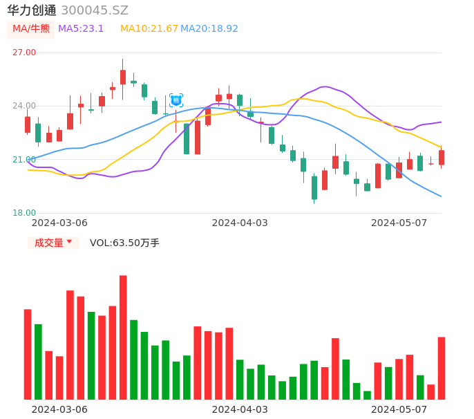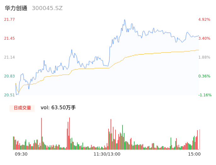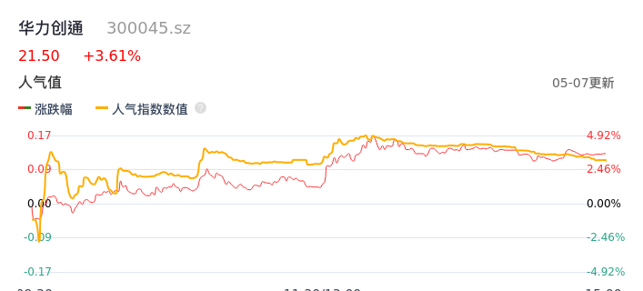 05月07日,华力创通收报21.50,股价涨幅3.61%,成交金额13.50亿元,换手率12.89%。