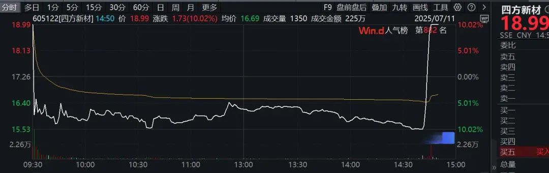 人气股四方新材尾盘直线拉升涨停,上演“天地天”行情,走出5连板。该股今早以涨停开盘,尾盘一度触及跌停。