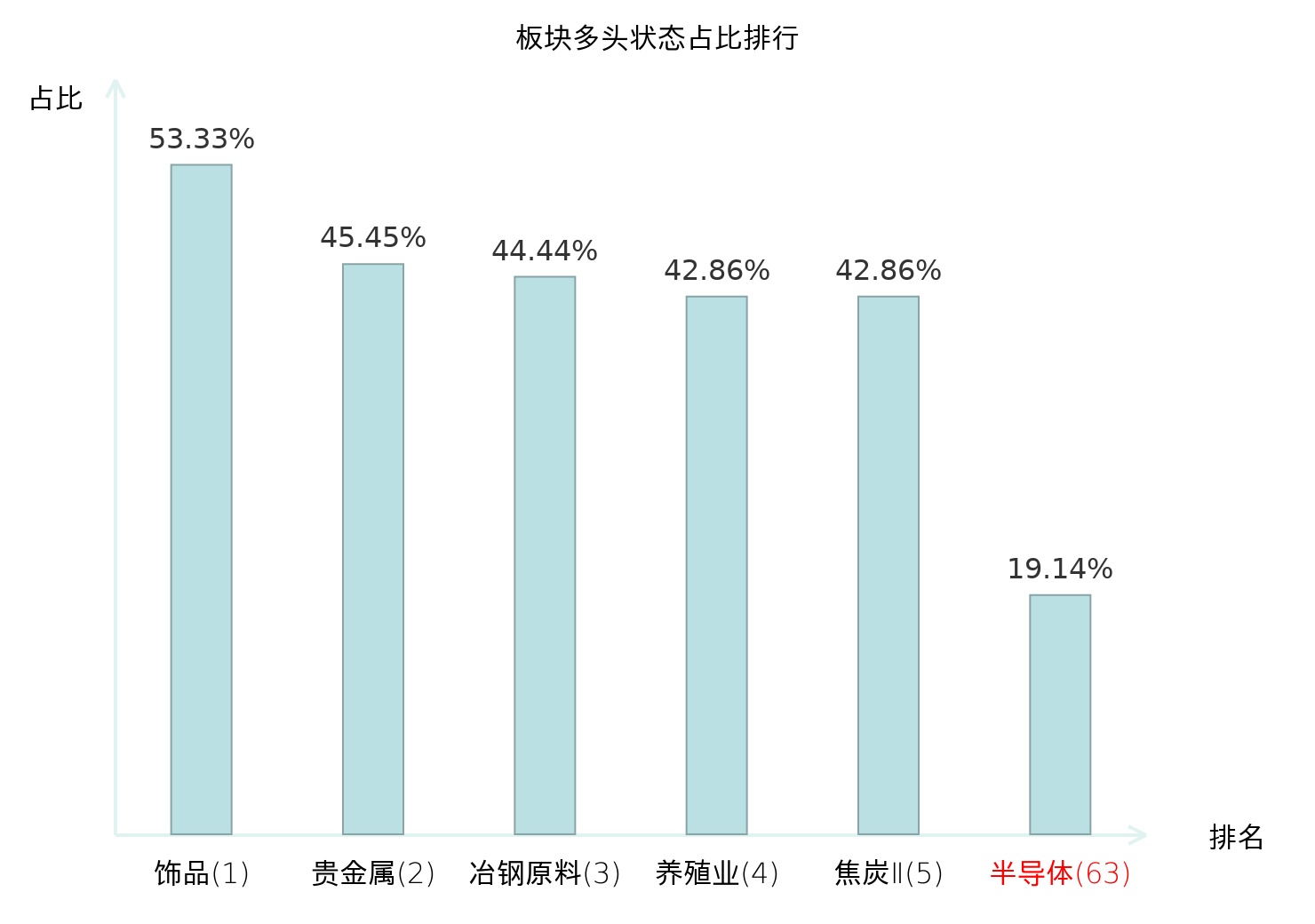 全市场所有行业板块中主力多头状态占比排名中,饰品板块位居第一。非金属材料Ⅱ板块名次提升最快,较昨日上升58位。
