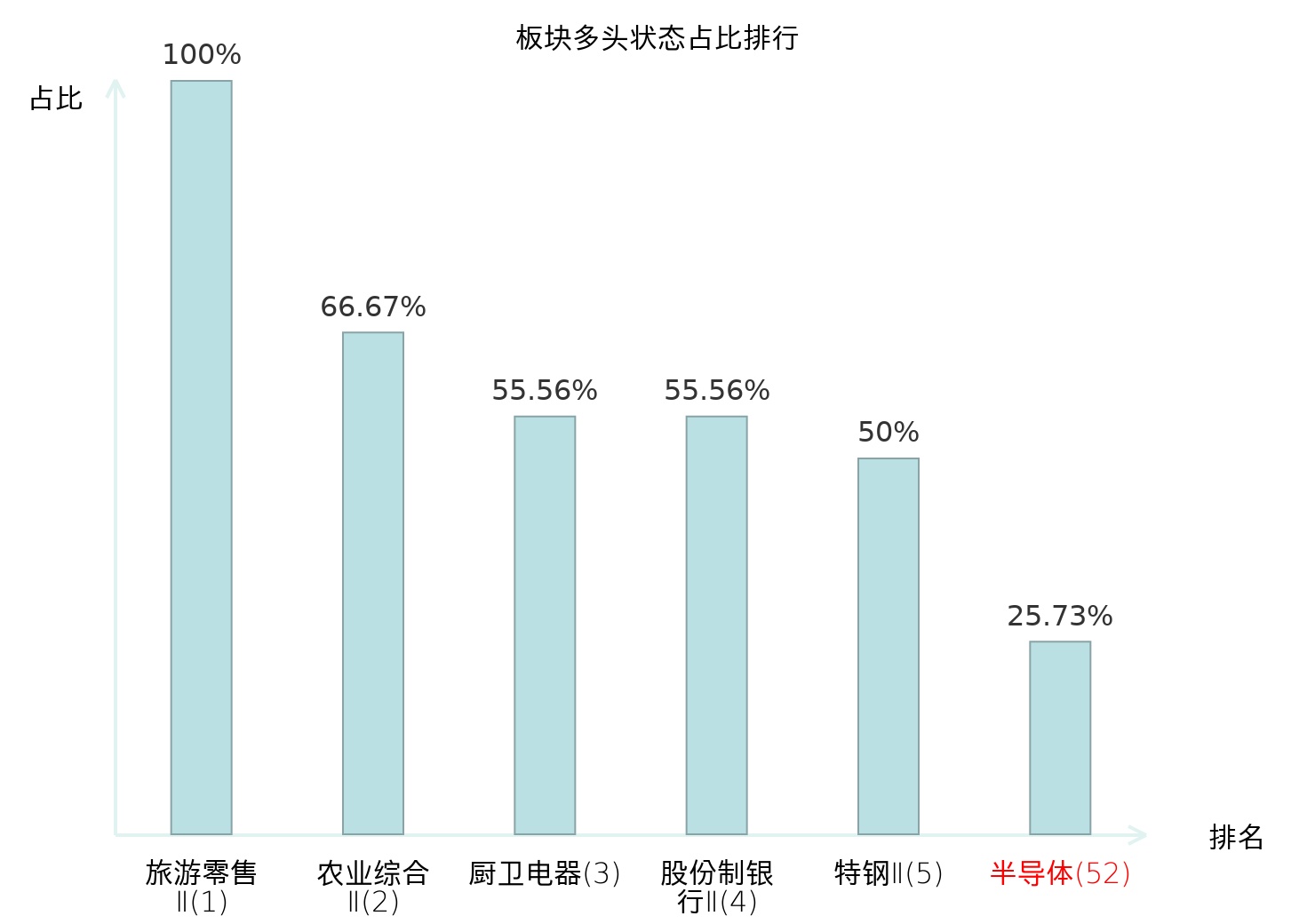 全市场所有行业板块中主力多头状态占比排名中,旅游零售Ⅱ板块位居第一。装修装饰Ⅱ板块名次提升最快,较昨日上升75位。