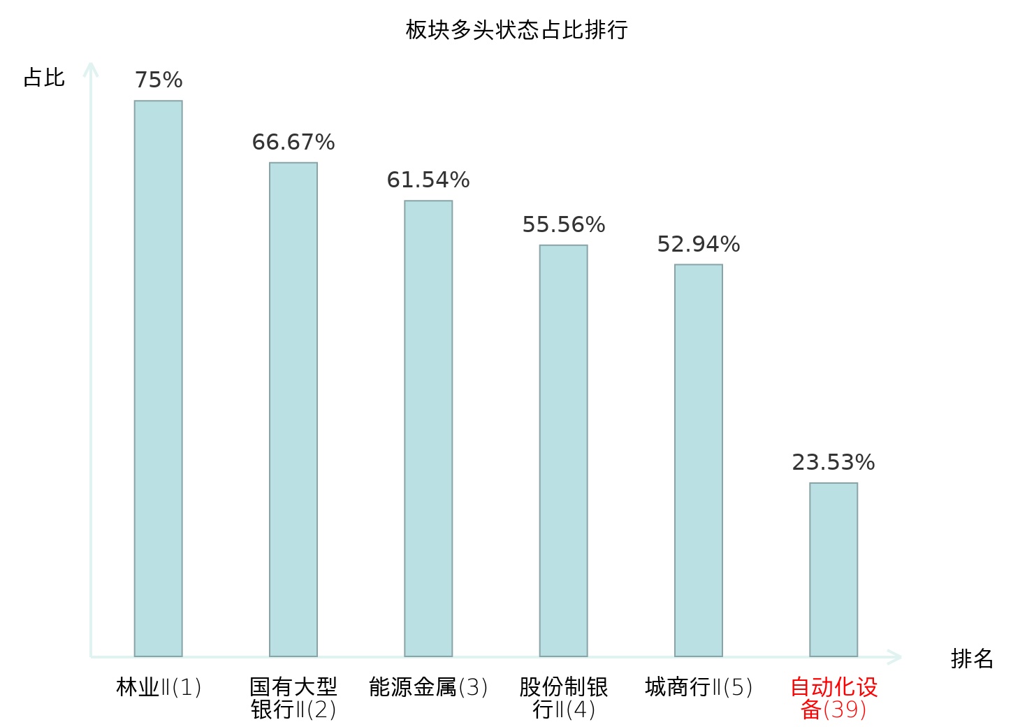 全市场所有行业板块中主力多头状态占比排名中,林业Ⅱ板块位居第一。动物保健Ⅱ板块名次提升最快,较昨日上升82位。
