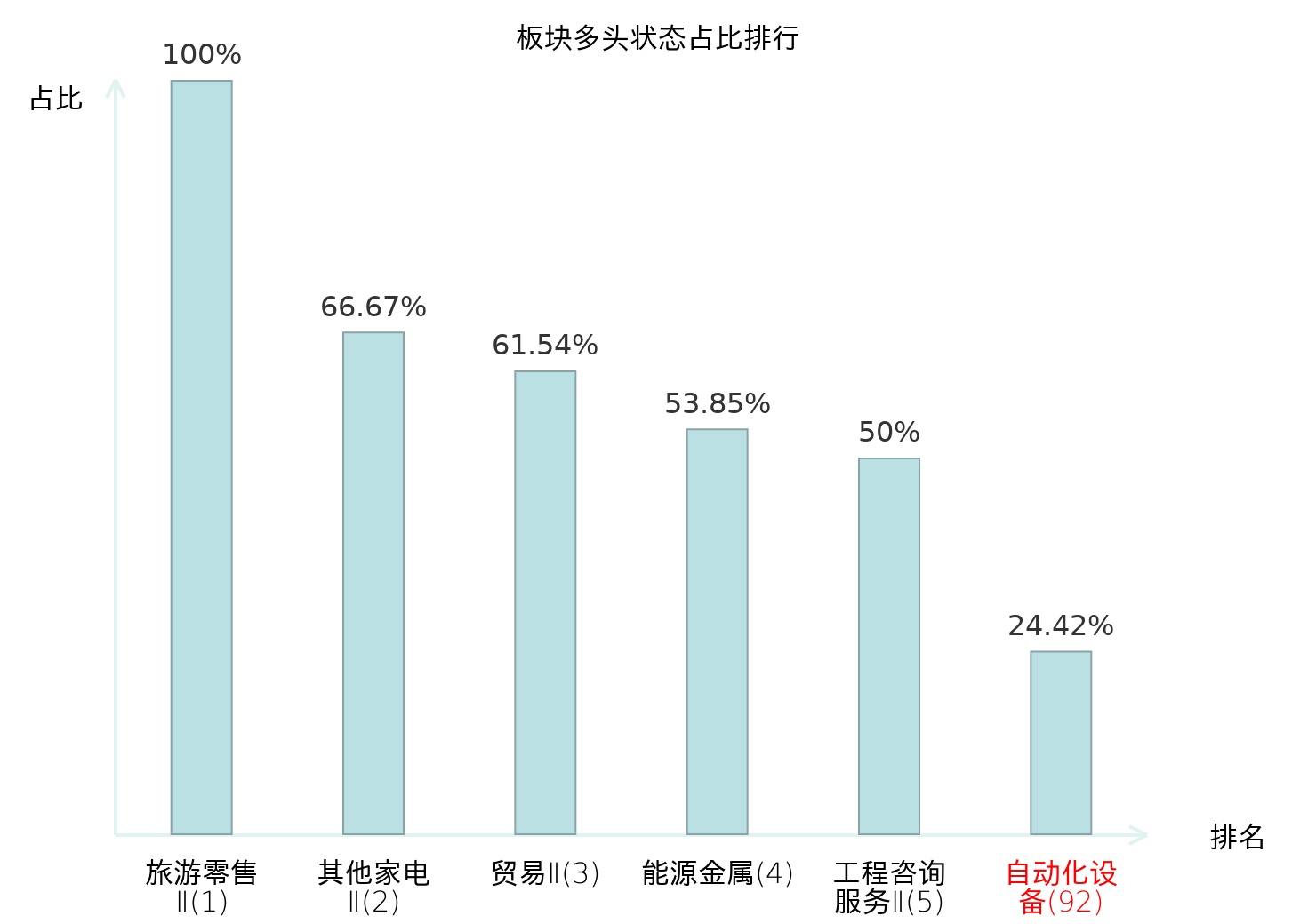 全市场所有行业板块中主力多头状态占比排名中,旅游零售Ⅱ板块位居第一。冶钢原料板块名次提升最快,较昨日上升37位。