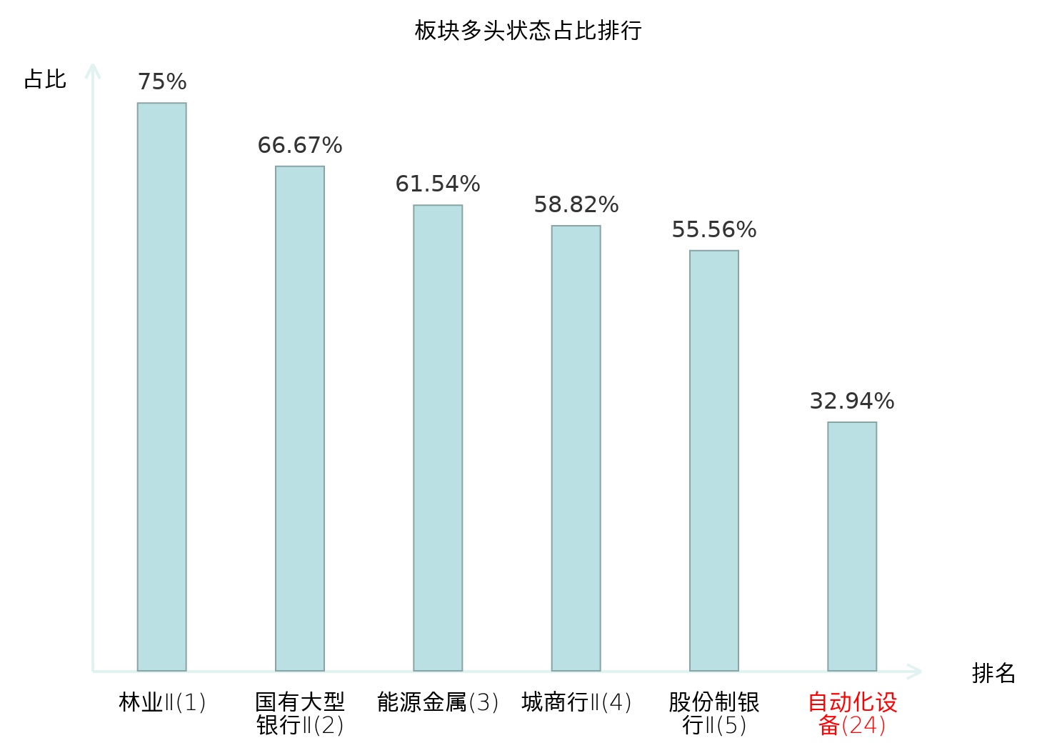 全市场所有行业板块中主力多头状态占比排名中,林业Ⅱ板块位居第一。专业连锁Ⅱ板块名次提升最快,较昨日上升63位。