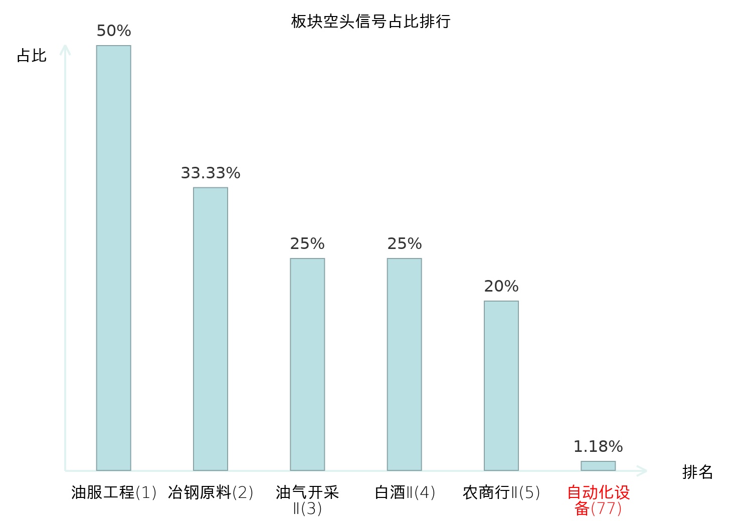 全市场所有行业板块中主力空头信号占比排名中,油服工程板块位居第一。白酒Ⅱ板块名次提升最快,较昨日上升110位。