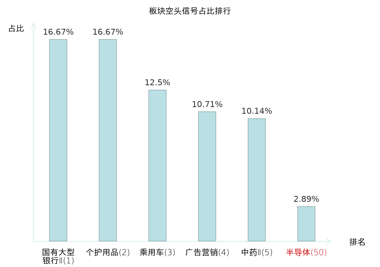 全市场所有行业板块中主力空头信号占比排名中,国有大型银行Ⅱ板块位居第一。医疗服务板块名次提升最快,较昨日上升110位。