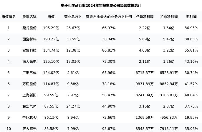 鼎龙股份最新报告期数据为年报,下表汇总了电子化学品行业内市值靠前的公司年报主要经营数据